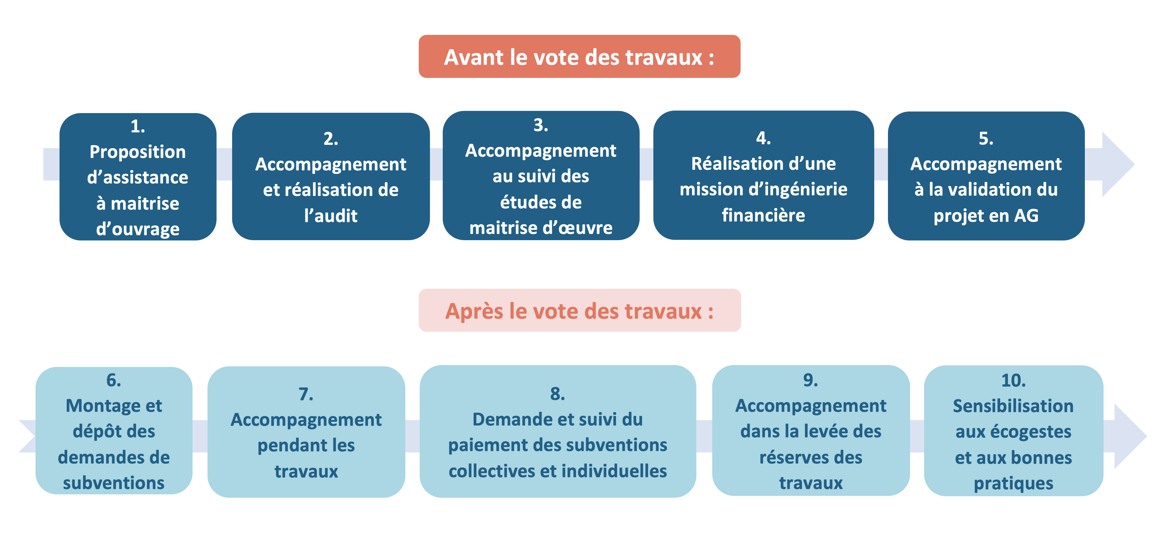 Nous sommes en mesure d’apporter une assistance administrative, technique, financière, juridique et sociale nécessaire à la réalisation des travaux dans les copropriétés, en lien avec les syndics de copropriété, les conseils syndicaux et les syndicats de copropriété. À ce jour, SOLIHA accompagne plus d’une quarantaine de copropriétés dans leurs projets de travaux.